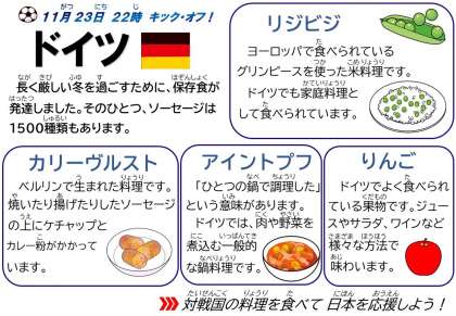 11月20日にワールドカップが開幕しました。今日、給食で食べるのは、23日の夜にキック・オフするドイツの料理です。