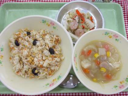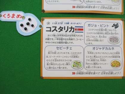 今日は、27日にキック・オフするコスタリカの料理を給食でいただきました。コスタリカでは、お米と豆の料理をよく食べます。そのひとつが、黒豆入りのお米料理で、コスタリカの定番の家庭料理「ガチョ・ピント」です。黒豆の実物を給食コーナーに掲示したところ、カタール料理で食べたレンズ豆との違い(色、大きさ、形など)を観察している子が何人かいました。