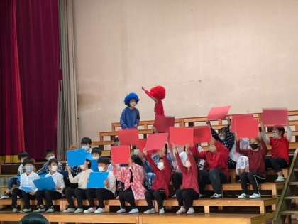 2年生は「泣いた赤おに」です。心優しい鬼と子どもたちの触れ合いを感動的に演じます。