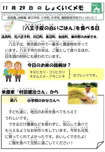 今日は、保育園、幼稚園、都立学校、小学校、中学校、義務教育学校でいっせいに!「八王子産の白いごはん」をいただきました。また、ごはんと一緒にいただく「はっちくんのみそ汁」では、八王子でとれた野菜、にんじん、だいこん、こまつな、ながねぎを使いました。地元で育った食材を地元で味わう、地産地消。自然の恵みや生産者の方に感謝しながら、味わってください。