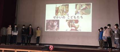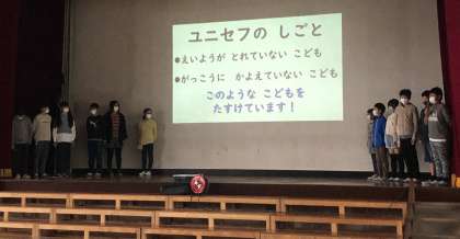 12月1日(木)の児童集会で、代表委員がユニセフ集会を行いました。代表委員会の発表を通して、全校がユニセフの取り組みについて知ることができました。練習を重ねてきたことで、堂々とした発表ができていました。12月5日(月)からの3日間、代表委員が募金活動を行います。