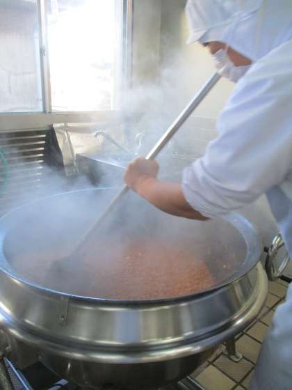2枚目の画像は、ミートソースを煮込んでいるところです。たっぷりの玉ねぎをじっくり炒めてから、ぐつぐつと煮込んでつくるミートソース。このおいしさは、給食だからこそ出せる味わいです。