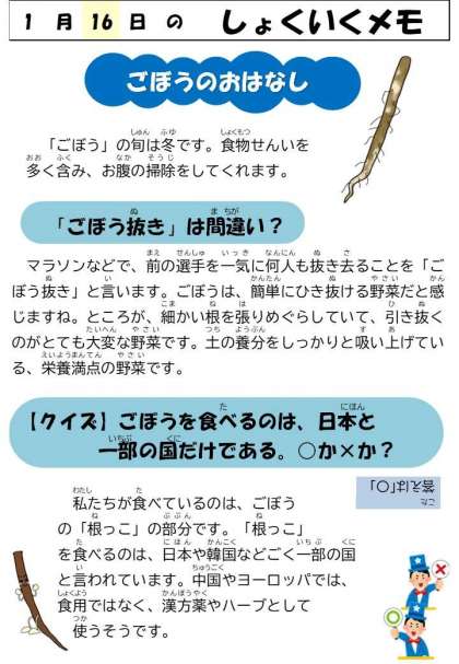 今日は、冬が旬のごぼうを使ってきんぴらをつくりました。きんぴらは、東京の郷土料理で、江戸時代後半には庶民の惣菜としてよく食べられてきました。