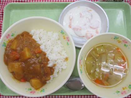 今日は、子どもたちの好きな給食調べで、「炭水化物部門」と「野菜・果物部門」で第1位に輝いた「カレーライス」と「みかん缶ヨーグルト」をいただきました。