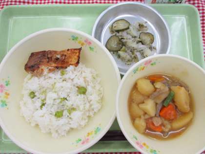 今日は、2年生がさやむきしたグリンピースをつかって、グリンピースごはんをつくりました。食育授業で、旬について学んだあと、自分たちの感覚をフル活用してグリンピースを観察しました。目で、手で、耳で、鼻で、心で観察をしたこどもたち。給食の時間は口で観察。「おいしかった〜」と元気いっぱい教えてくれた2年生のみなさん、グリンピースのさやむき、ありがとう!!