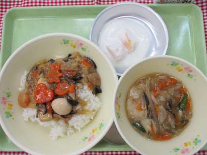 今日は、中華丼のにんじんを「さかな」「くま」「ハート」に型抜きしてつくりました。子どもたちは、何かが入っている!と興味津々。僕のはさかな、私はくまとハートがあった、これは何の形?とうれしそうな表情で食べていました。