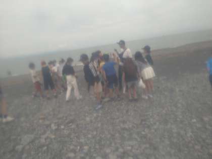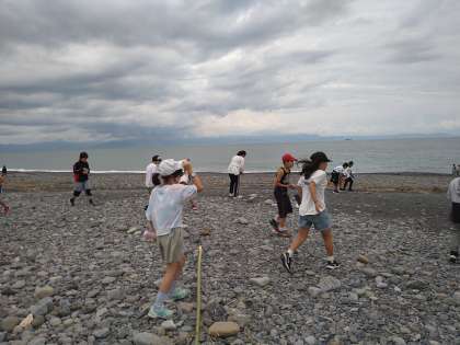 6月8日(木)一度宿舎に着き、荷物を降ろすとすぐに近くにある三保の松原に行きました。両側に松の木のある木道を通り、小高い丘を超えると、海岸線が広がっていました。担任の先生から「天の羽衣」の話を聞いた後で、子ども達は、石や貝殻を拾いながら散策しました。こういう時間が子ども達にとっては楽しいようで、見つけた物を近くの先生に嬉しそうに見せに来ていました。