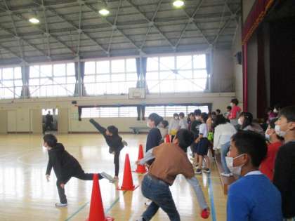 5月15日(月)体力テストに向けて、紅白の玉を使って、投げる練習をしました。体育館で行いました。体力テストでは、握力や反復横跳び、立ち幅跳びなどの種目を通して、子ども達の体力を一人一人調べていきます。