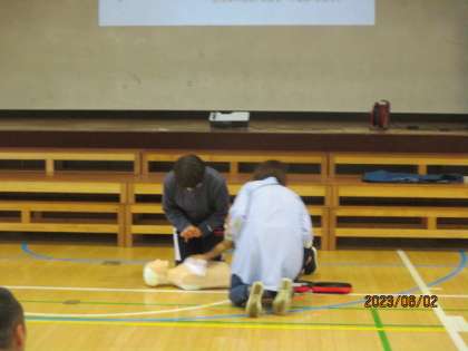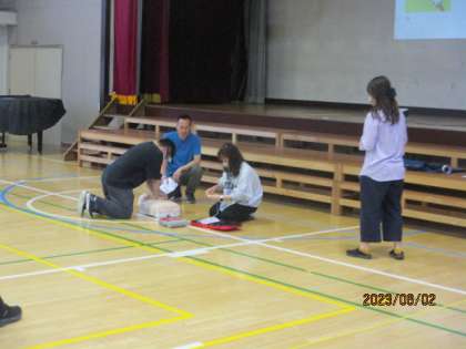6月2日(金)水泳指導の開始に備えて、職員が体育館で心肺蘇生法の研修会を行いました。体育部の先生が研修を受けに行き、還元研修という形で実施しました。消防署から人形を借りてきて、心臓マッサージの仕方などについて学びました。実際にないことが1番なのですが、いざという時に備えておくことは必要です。先生たちも、真剣に取り組んでいました。