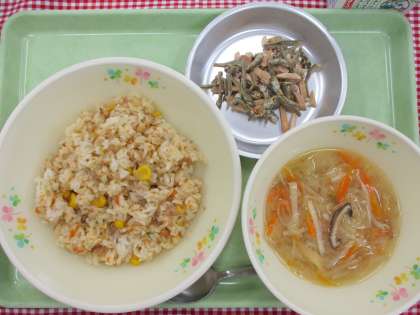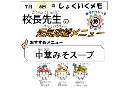 今日は、元気応援メニューの日です。「児童の元気を応援するためにこの給食を食べてほしい」という想いを込めて、校長先生がおすすめするメニューは、体の調子を整えて、元気な体をつくるもとになる野菜がたくさん入っている「中華みそスープ」です。