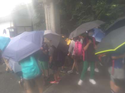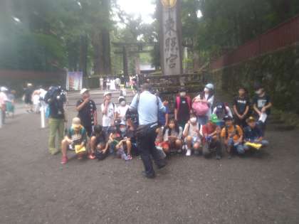 7月12日(水)食堂から外に出ると雨が降っていたので、傘を差して歩きました。東照宮の参道を真っ直ぐ進んで突き当たりにある八王子市千人同心の記念碑を見ました。日光ガイドで調べてきた子どもの説明を聞きながら見学したので、理解が深まりました。東照宮に入る前、クラスごとに写真を撮りました。