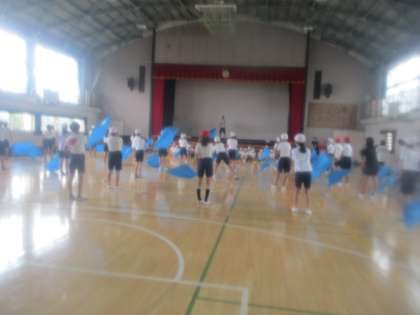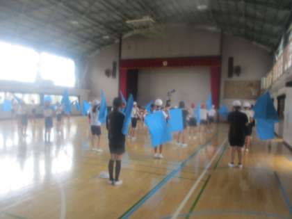 9月4日(月)、30日(土)の体育学習発表会に向けて、少しずつ取組が始まっています。3時間目には、体育館で5・6年生が合同で練習していました。この日は朝から雨で、気温はそれ程高くはなかったのですが、湿度が高く、子どもたちは蒸し暑い中、一つ一つの動きを覚えていました。