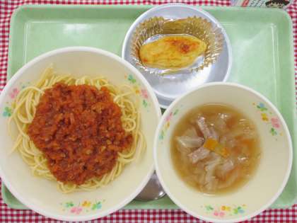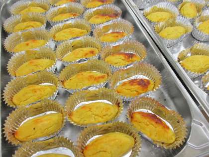 今日は、ふかしたさつまいもに砂糖・牛乳・バター・生クリームを練り混ぜて、スイートポテトを作りました。さつまいもの鮮やかな黄色と甘い香りが食欲をそそります。子どもたちからは「おいしかったよー」と好評でした。