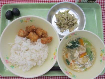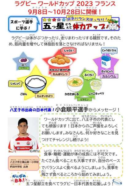 今日は「五つ星そろえて体力アップ」の日です。何をどれくらい食べたらいいかを5つの☆(主食、主菜、副菜、果物、乳製品)と大きさで表しています。今回は、八王子市出身、ラグビーの日本代表である小倉選手に食事の大切さについて、コメントをいただきました。