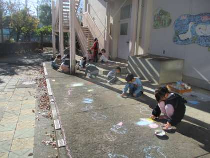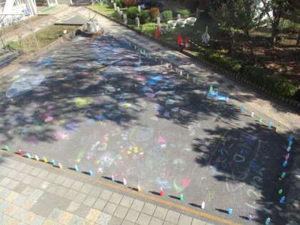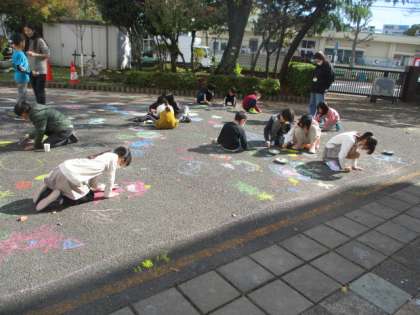 11月20日(月)今回の展覧会では、自転車でのご来校を控えていただくようお願いしています。いつもの自転車置き場もキャンパスになりました。1年生と2年生が、チョークでアスファルトの部分に絵を描きました。来校した人たちを華やかに出迎えてくれます。名付けて「ようこそロード」です。