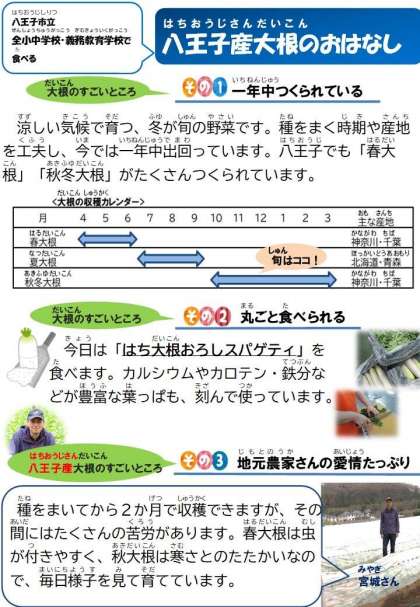 今日は、八王子産の大根を丸ごと活かした「はち大根おろしスパゲティー」をいただきました。八王子産大根のすごいところなどを食育メモにまとめましたので、ご覧ください。