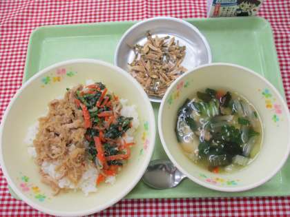 かりっと仕上げたいりことアーモンドに、煮詰めたしょうゆ・さとう・みりんを絡ませ、グラニュー糖とゴマをまぶした「ごまめナッツ」は、給食アンケートで上位に入るほど、子どもたちに人気の給食です。