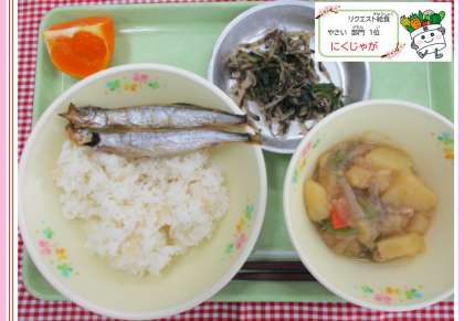 今日は、給食アンケートの野菜部門で1位に輝いた「肉じゃが」をいただきました。じゃがいものまわりが少しほろほろっと崩れる具合に仕上げられた「肉じゃが」は、どの学年の子も喜んで食べてくれます。