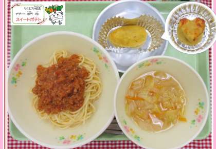 今日は、給食アンケート・デザート部門で第1位に輝いた「スイートポテト」をいただきました。さつまいもがもつ自然の甘さがいきた手作りスイートポテトです。今日で小学校生活最後の給食となる6年生には、調理員さんが「卒業おめでとう」の気持ちをこめてハート型のスイートポテトをつくってくれました。