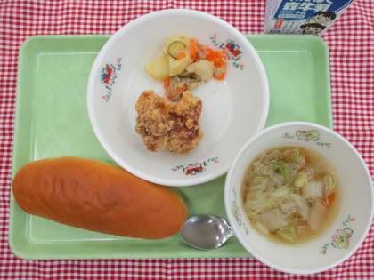今日は、みんなが大好きな鶏のから揚げが主菜でした。から揚げを楽しみにしていた子も多く、どのクラスもいい笑顔で食べている子がたくさんいました。