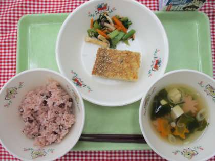 今日は、1年生を迎える会が行われました。給食室からは「入学おめでとう!」と「進級おめでとう!」の気持ちをこめて、お祝い献立をつくりました。