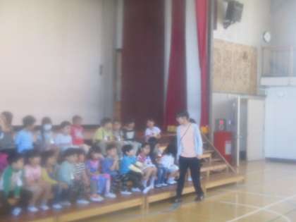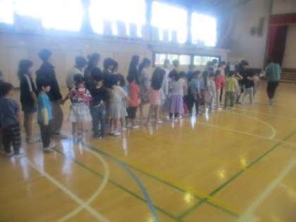 4月25日(木)委員会紹介集会の後に、1年生と6年生が体育館に残り、1年生を迎える会の入場の練習をしました。6年生が1年生の手を取り、手をつないで入場します。日頃、朝の支度などを手伝ってくれるお兄さん、お姉さんと一緒に入場するとあって、1年生の子どもたちも嬉しそうでした。退場は1年生だけで行います。その練習も一緒にしました。