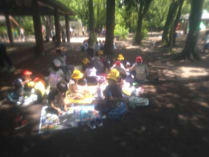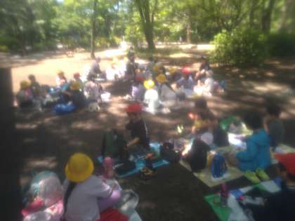 5月14日(火)お昼は、遊びの班で1・2年生一緒に食べました。たくさん体を動かしたので、おなかもペコペコです。おやつもあり、子どもたちは、おしゃべりを楽しみながら食べました。