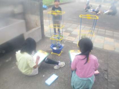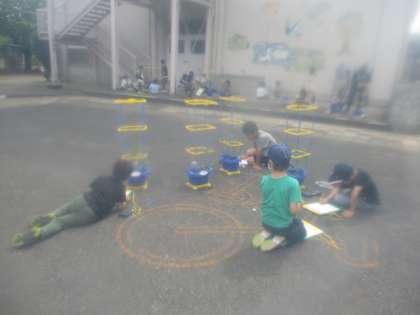 5月23日(木)2年生が職員昇降口の前で、ミニトマトを植えていました。写真は植えた後に観察しているところの様子です。寝転がるなど、子どもなりの視点でよく見て観察カードを描いていました。写真を撮っていると花が咲いていることや、すでに実がなっていることなど、子どもたちが気付いたことをいろいろと話しに来ました。