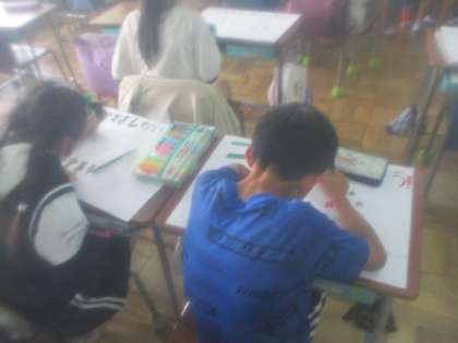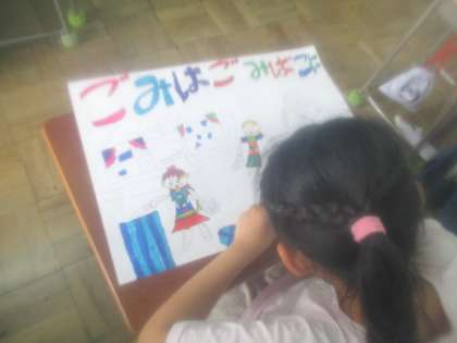 5月28日(火)4年生の教室では、環境についてのポスターを作っていました。毎年出品して八王子駅のバス停の地下に掲示される作品です。子どもたちは、ごみの削減の呼びかけなど、スローガンとともに思い思いの絵を描き、作品作りに取り組んでいました。