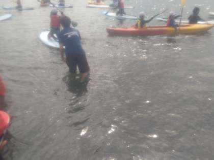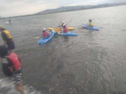 6月6日(木)午後は、体験活動でした。初めに体験についての説明を受け、ライフジャケットを着て体験活動を始めました。砂浜で練習した後に実際に海に入り、一人乗り、二人乗りカヌー、一人乗りのサップにそれぞれ乗り込み、マリンスポーツを満喫しました。最初は、前に進むのにも苦労していましたが、あっという間に操作に慣れ、すいすい進むことができました。みんな良い表情でした。