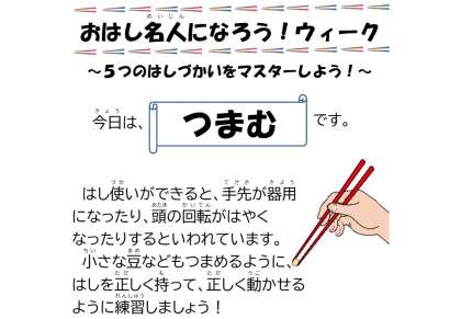 今日は「おはし名人になろう!ウィーク」3日目です。今日は、給食を食べながら「つまむ」箸使いに挑戦します。