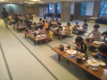 7月11日(木)夕飯は、牛すき鍋にメンチカツ、ナゲットに茶碗蒸しとこの日も豪華なメニユーが並びました。中にはご飯を5杯も食べるこ子もいて、みんなたくさん食べていました。この後、ナイトハイクです。