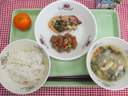 給食には、いろんな種類の野菜が使われています。たくさんの野菜を食べることで、みなさんの成長に必要な栄養をとることができます。夏に負けない元気な体をつくるためにも、みなさん、野菜をもりもり食べてください。