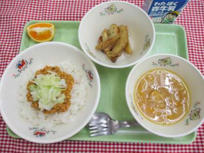 8月31日「野菜(831)の日」にちなんで、今日は野菜たっぷりの給食をいただきました。タコライスには約110gの野菜が、スープには約55gの野菜が入っています。