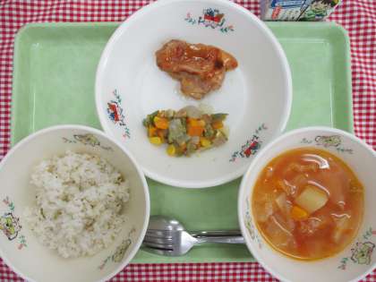 今日の副菜は、ベーコン・にんじん・たまねぎ・コーン・さやいんげんを炒め、塩こしょうで味付けした「ミックスソテー」です。食材それぞれの旨みや甘みが活きた料理で、子どもたちに好評でした。