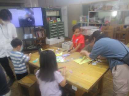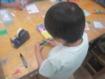 9月5日(木)1年生が図工室で授業をしていました。作るものは「すきまちゃん」です。すきまちゃんは、どこにでもこっそり入り込みます。うっかりすると、どこに隠れているか、分からなくなってしまうこともあります。両面テープを半分に折り、モールの手足をはさみこみます。あとは飾り付け。簡単にできるので、1年生の子どもたちも、楽しみながら作業を進めていきました。完成したすきまちゃんを、みんな思い思いのすきまに置いていきます。「あれ?」すきまちゃんがどこに隠れているのか、見つからなくなった子がいるようです。ほら、そこのすきまに隠れていますよ。