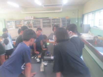 9月9日(月)6年生が理科室で実験をしていました。水溶液を蒸発させるとどうなるかを調べていました。液体がはねて目に入らないよう、実験用のゴーグルをかけて行いました。薄い塩酸なども使うので、みんな慎重に、集中して実験に取り組んでいました。