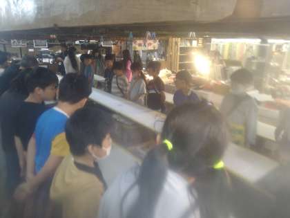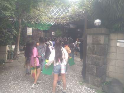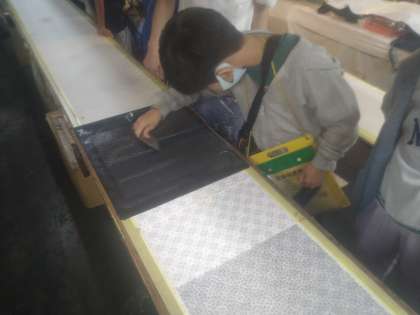 10月1日(火)東京染ものがたり博物館に着きました。歴史のあるたたずまいで、建物に入ると早速染めもの体験をしました。型紙にのりを混ぜ込んでいくのですが、端までしっかり塗り込むのはなかなか大変で、子どもたちは、ところどころお手伝いしていただきながら作業を進めていきました。