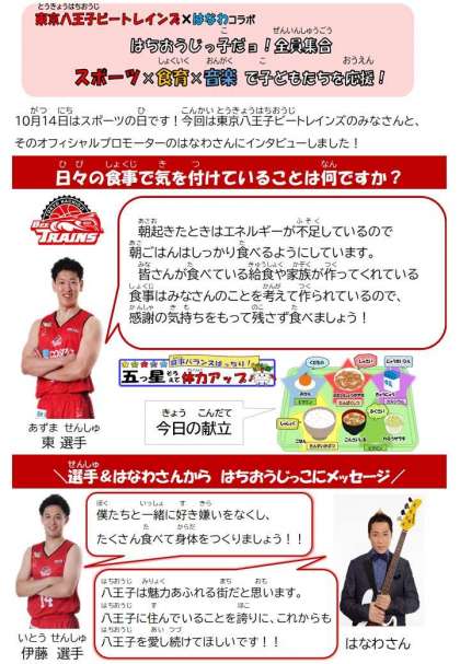 今日は「五つ星そろえて体力アップ献立」の日です。10月14日のスポーツの日にちなんで、東京八王子ビートレインズとそのオフィシャルプロモーターのはなわさんが、はちおうじっ子にメッセージを送ってくれました。