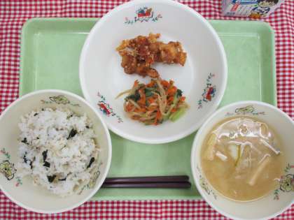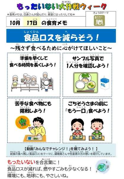 今週、15日から18日までの4日間、食べ残しを減らすために何ができるかをみんなで考える「もったいない大作戦」に取り組みます。3日目の今日は、給食の食べ残しをテーマに、生産者の方や調理員さんの想いを紹介する動画を見ながら、子どもたちに人気の唐揚げと、苦手な子が多いわかめごはんや野菜たっぷりの和え物と汁物をいただきました。食べ物を大切にするとは何か、動画を通じてひとりひとりが考え、食べることに向き合えるといいと思います。