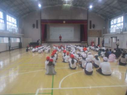 10月17日(木)体育館で全校児童が集まり、音楽朝会を行いました。この日は、体育学習発表会に向けて応援歌の練習をしました。練習の前に6年生による応援も繰り広げられ、全校の子どもたちの気分を盛り上げてから歌いました。本番も大きな声で歌う子どもたちの姿をご覧ください。