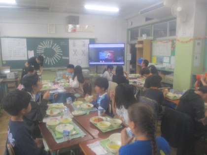 10月18日(金)給食の献立のページにも載せましたが、八王子市では、毎年10月の「食品ロス削減月間」にあわせて、小・中学校で「もったいない大作戦」に取り組んでいます。今年は、15日(火)から18日(金)までの4日間でした。食べ残しを減らすために何ができるかクラスごとに目標を考え、ひとりひとりの力を合わせて取り組んできました。この日は、最終日で、八王子市オリジナル食育ソングの動画を見ながら、給食を食べました。「もったいない大作戦」は終わりますが、これからも好き嫌いを減らし、バランスよく食べることで食品ロスを減らし、丈夫な体を作っていきましょう。