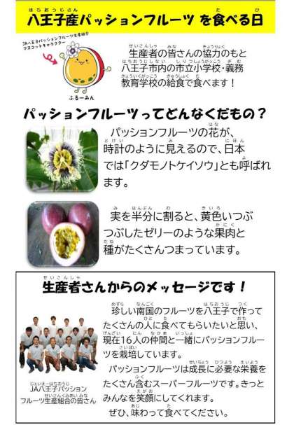 10月30日の給食 公開日 2024/11/01 更新日 2024/11/01 今日の献立 *献立* スパゲティミートソース 野菜スープ ヨーグルトのパッションフルーツソースがけ 牛乳 ☆きょうの八王子産☆ パッションフルーツ いいね(0)