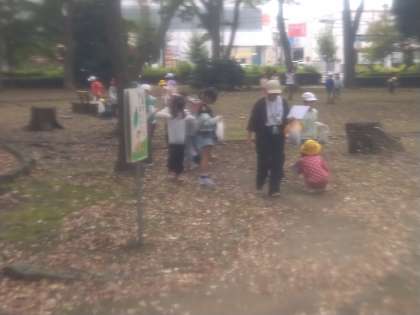11月5日(火)公園では、どんぐりを集めるグループと遊ぶグループに分かれて活動しました。どんぐりはたくさん落ちていて、子どもたちは、袋にたくさん集めていました。遊ぶグループは、鬼ごっこをしたり、遊具を使って遊んだり、公園の中を駆け回っていました。