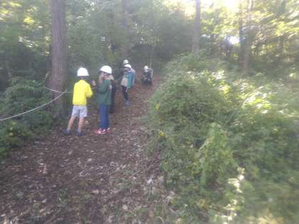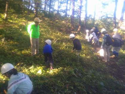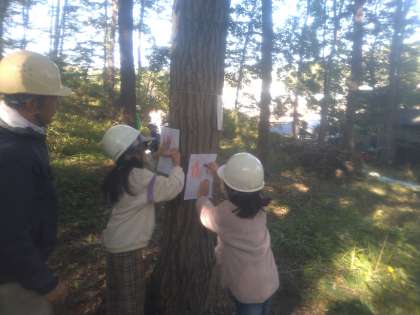 11月12日(火)体験は三つのグループに分かれて行いました。大きなハサミで下草刈りをしたり、拓樹と言って樹皮の模様を写しとったり、森に隠れているものを探したりしました。それぞれのグループに緑遊会の方がついてくださり、教わりながら体験をしました。