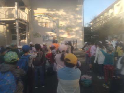 11月14日(木)朝から快晴です。今日は、3・4年生の遠足です。昇降口の前で出発式をしました。3・4年生で助け合って行ってきます。