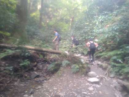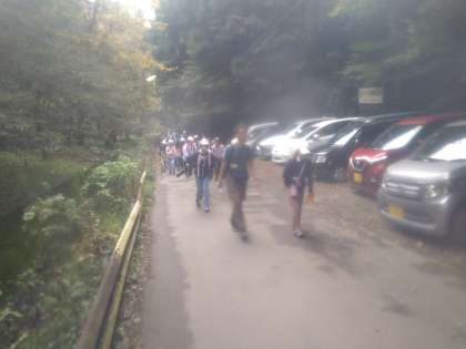 11月14日(木)登山は、班ごとに行いました。登り始めは比較的なだらかなのですが、次第に道幅が狭くなり、石や木の根が生い茂る場所を登っていきます。最後にひたすら続く階段を登りようやく頂上です。子どもたちは、足元に気を付けながら、班で声を掛け合って登っていました。
