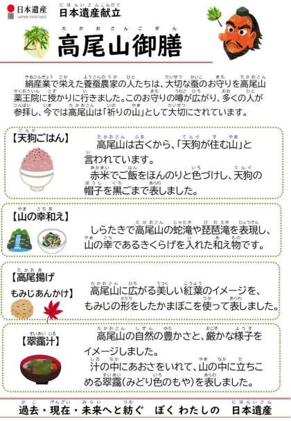 今日は、日本遺産に認定されている高尾山をモチーフにした「高尾山御膳」をいただきました。給食の時間に、高尾山へ遠足に行く3・4年生の教室を訪ね「霊気満山高尾山〜人々の祈りが紡ぐ桑都物語〜」と高尾山御膳について話をしました。
