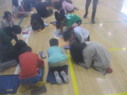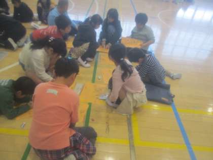 11月13日(水)体育館で3・4年生が合同で、次の日に行われる遠足の事前学習をしていました。春に実施するはずでしたが、雨で延期となっていたのです。当日は、3・4年生合同で編成された班ごとに行動します。子どもたちは、班のメンバーや班のめあてなどをしおりに書き込んでいました。仲良さそうに作業を進めていました。