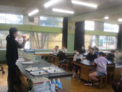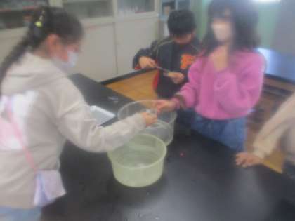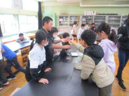 11月21日(木)理科室で4年生が理科の実験をしていました。この日は、空気を温めたり冷やしたりしたときの体積の変化を調べる実験でした。子どもたちは、ガラス管にゼリーを詰めた三角フラスコを、お湯と氷の入った水槽に交互につけて、ゼリーが上下に移動する様子を確かめ、そのたびに歓声を上げながら実験に取り組んでいました。